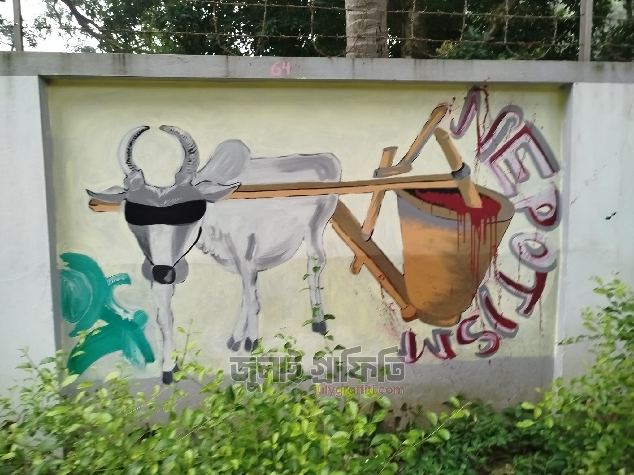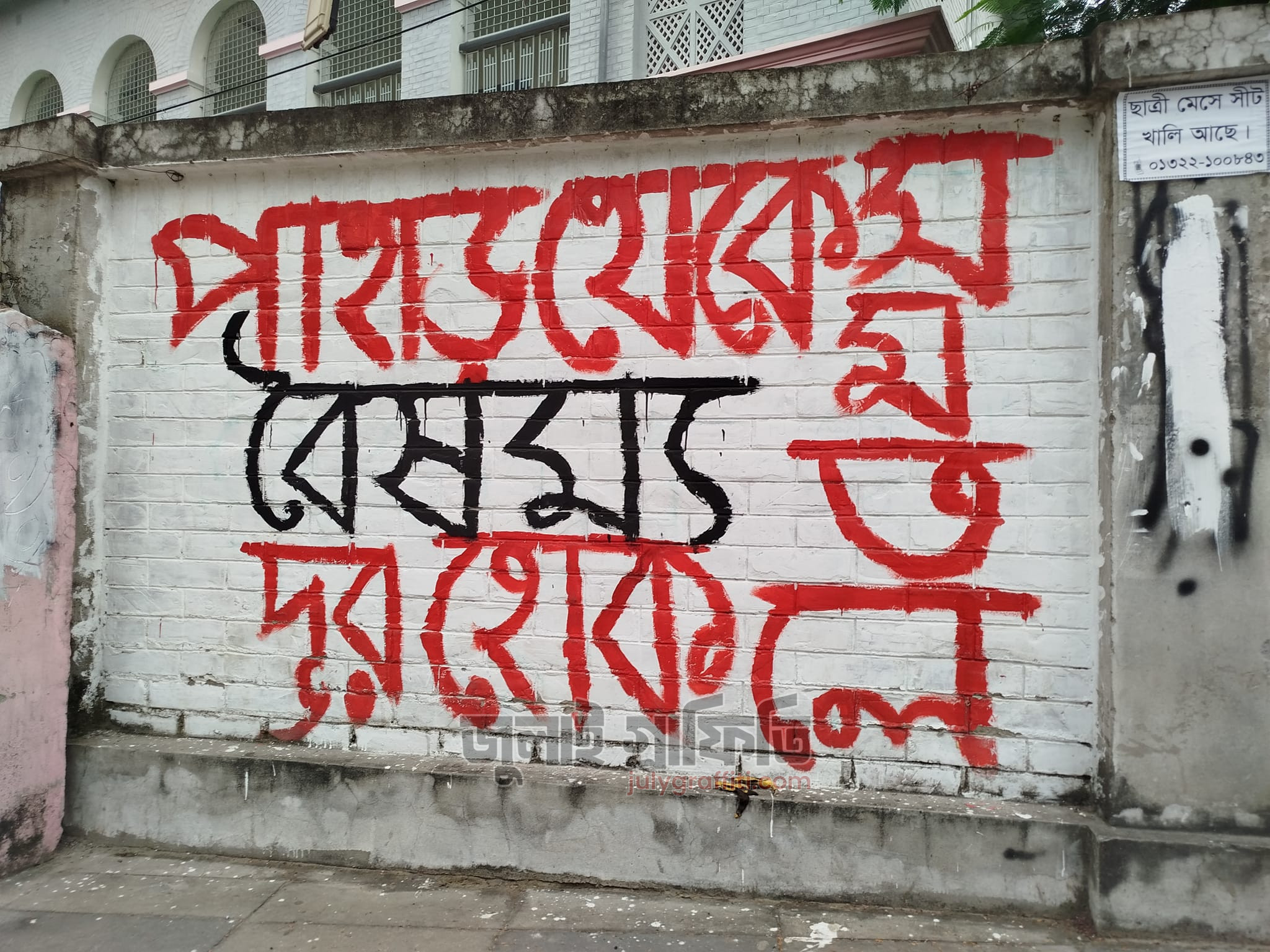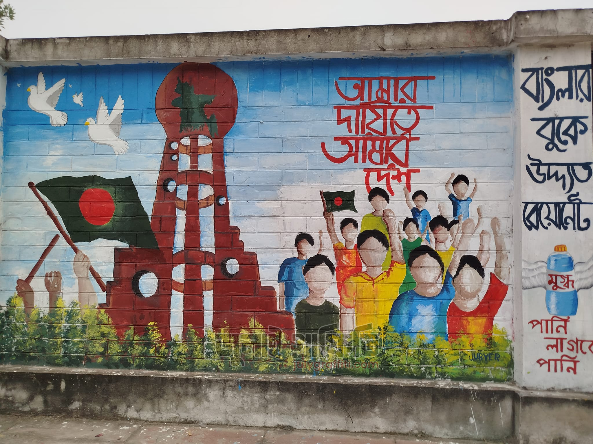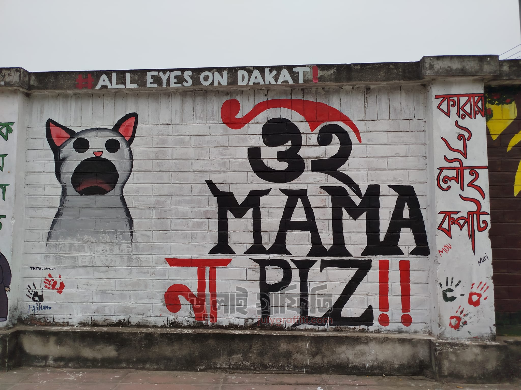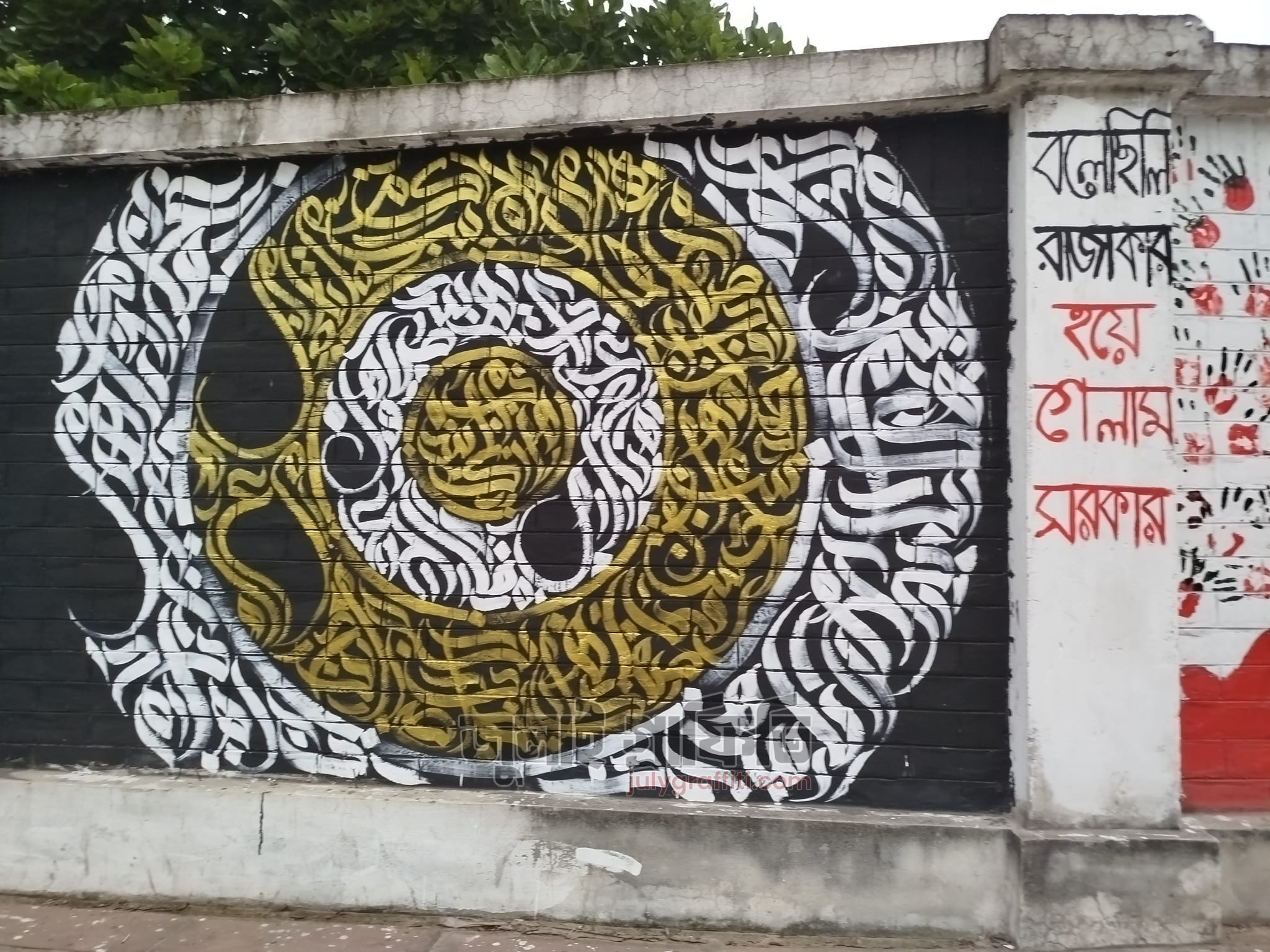 বরেন্দ্র জাদুঘর উল্টো দিকের দেয়াল ঘেঁষে গ্রাফিতি ২ রা নভেম্বর, ২০২৪ ছবি: সিলমী সাদিয়া