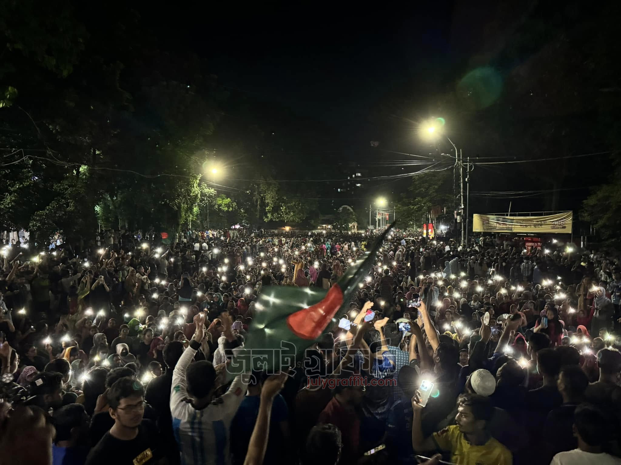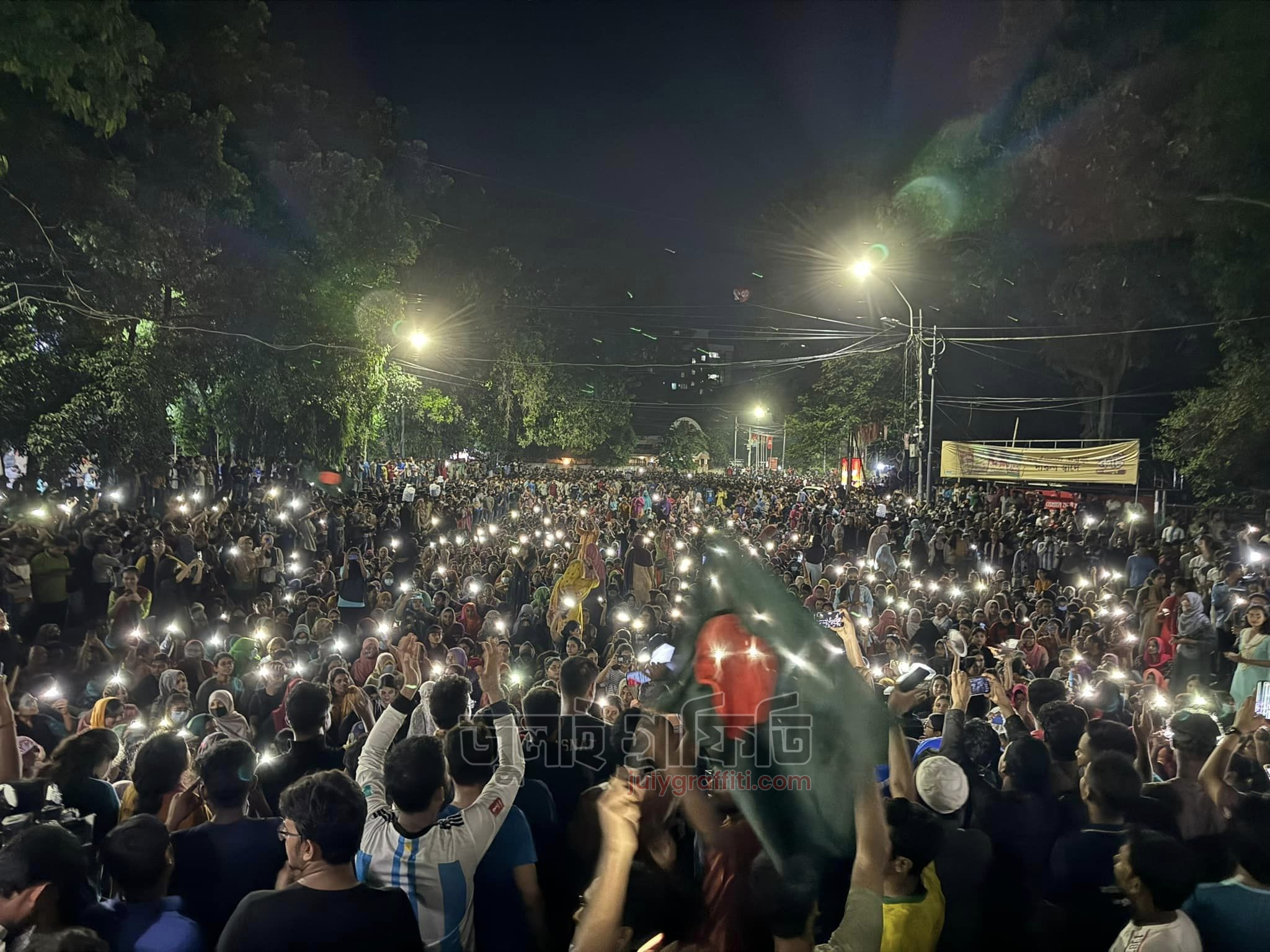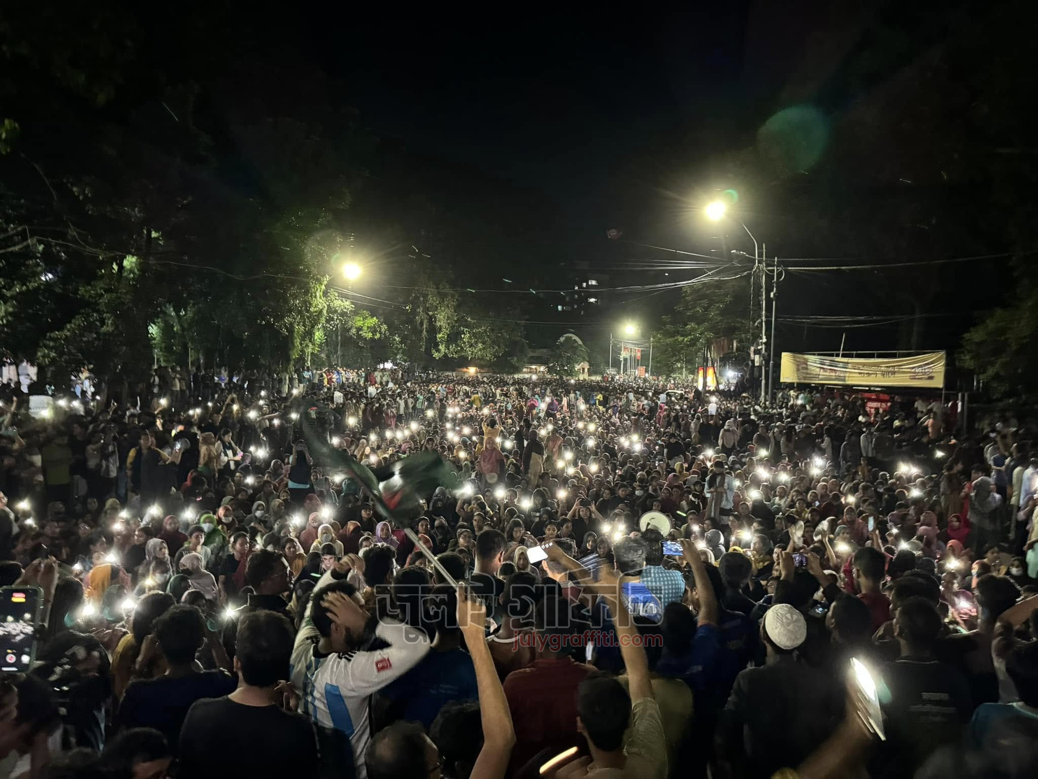 ১৫ জুলাই মধ্যরাত, রাজু ভাস্কর্যের সামনে ঢাকা বিশ্ববিদ্যালয় শিক্ষার্থীরা। ছবি: ইয়াসির আরাফাত