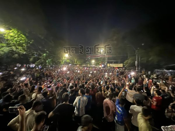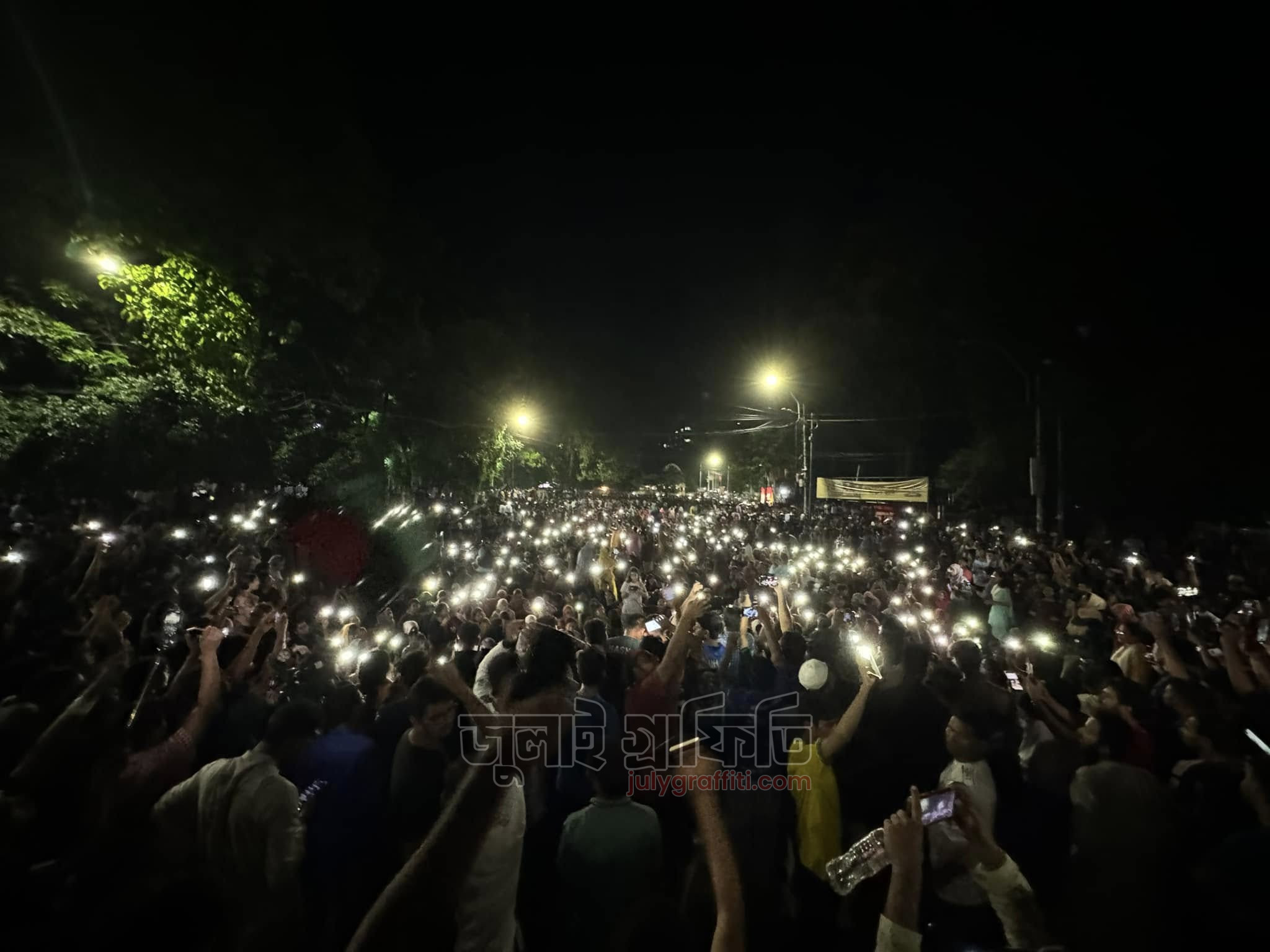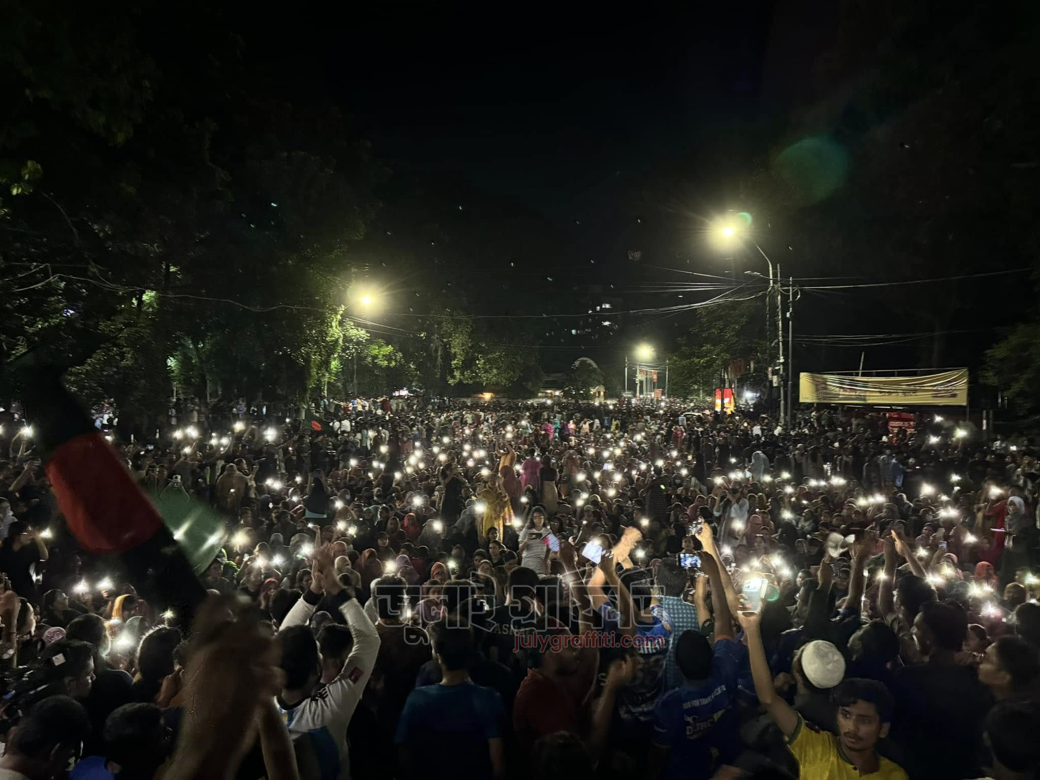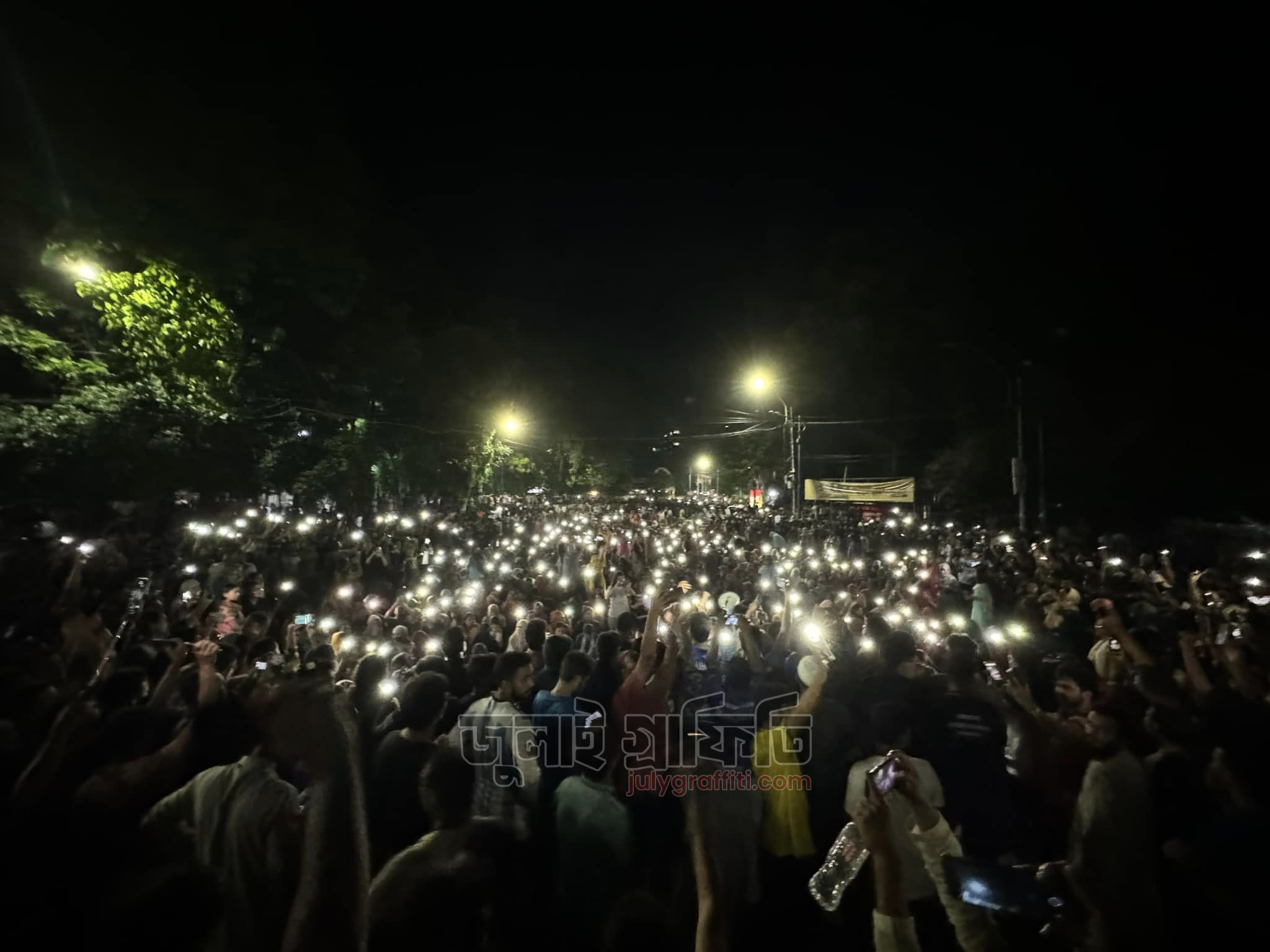 ১৫ জুলাই মধ্যরাত, রাজু ভাস্কর্যের সামনে ঢাকা বিশ্ববিদ্যালয় শিক্ষার্থীরা। ছবি: ইয়াসির আরাফাত